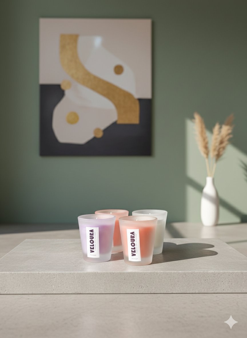 Discover Veloura by Velomyyst, a handcrafted collection of premium frosted glass candles designed to soothe your soul and elevate your space.
